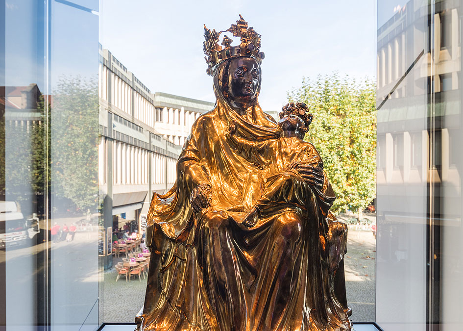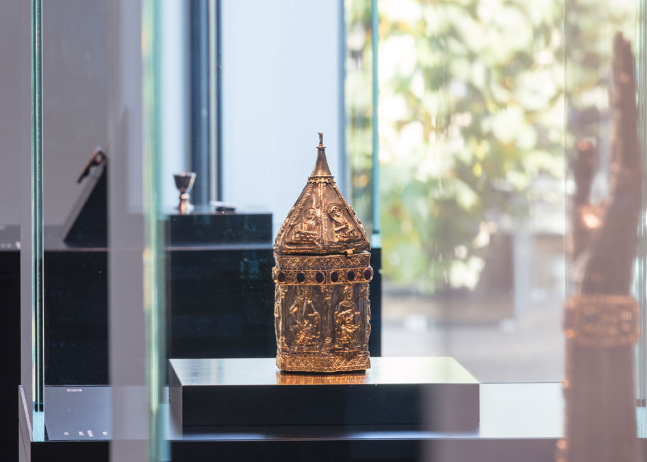 Die Hauptexponate sind im ersten Geschoss ausgestellt, und ihre Präsentation ist auf die Eigenwirkung des Objekts ausgelegt. Die Hauptachse bildet das unmittelbare Gegenüber der Maria mit dem Jesuskind im Arm und dem Jesus am Mindener Kreuz, dem berühmtesten Objekt der Sammlung. Im zweiten Obergeschoss geht es weiter mit den Teilen der Sammlung aus der Zeit nach 1500, und der Raum ist in Anlehnung an eine Sakristei konzipiert – also den ursprünglichen Aufbewahrungsort des liturgischen Geräts. Hier befindet sich außerdem die Bibliothek.