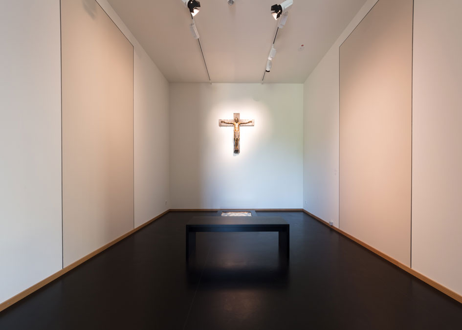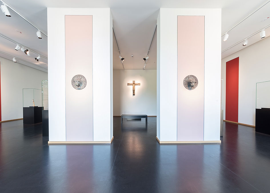 Obergeschoss, in denen die mittelalterlichen Preziosen, die für die Werte des katholischen Glaubens stehen, unausweichlich in die Gegenwart geholt werden und im Austausch mit dem Hier und