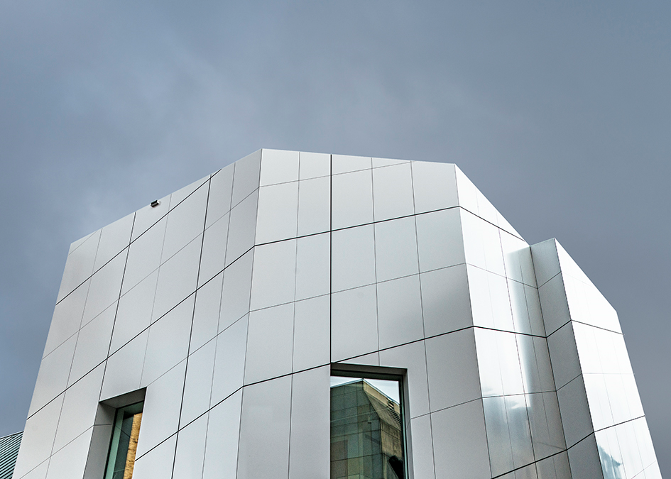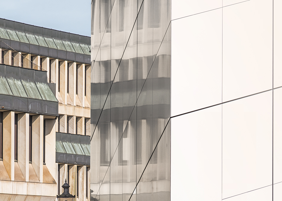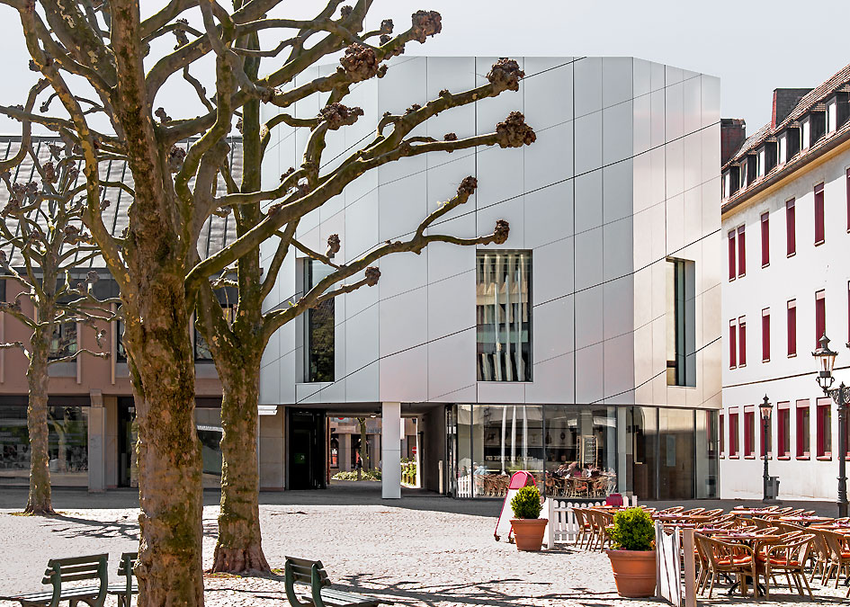 Das Gebäude zeigt sich von allen Seiten als metallverkleideter Kubus. Die Oberfläche bilden mattsilberne Alucobond-Platten in Rautenform. Nur der Eingangsbereich weicht als Bauteil mit geschosshohem Glas ab. Hier wird die Gestaltung der Umgebungsbebauung aufgegriffen: Um den Kleinen Domhof herum gruppieren sich Boutiquen und Cafés in gleicher Optik, in die sich das neue Gebäude wie selbstverständlich einfügt. Hier befindet sich auch der Haupteingang zum Domschatz Minden.