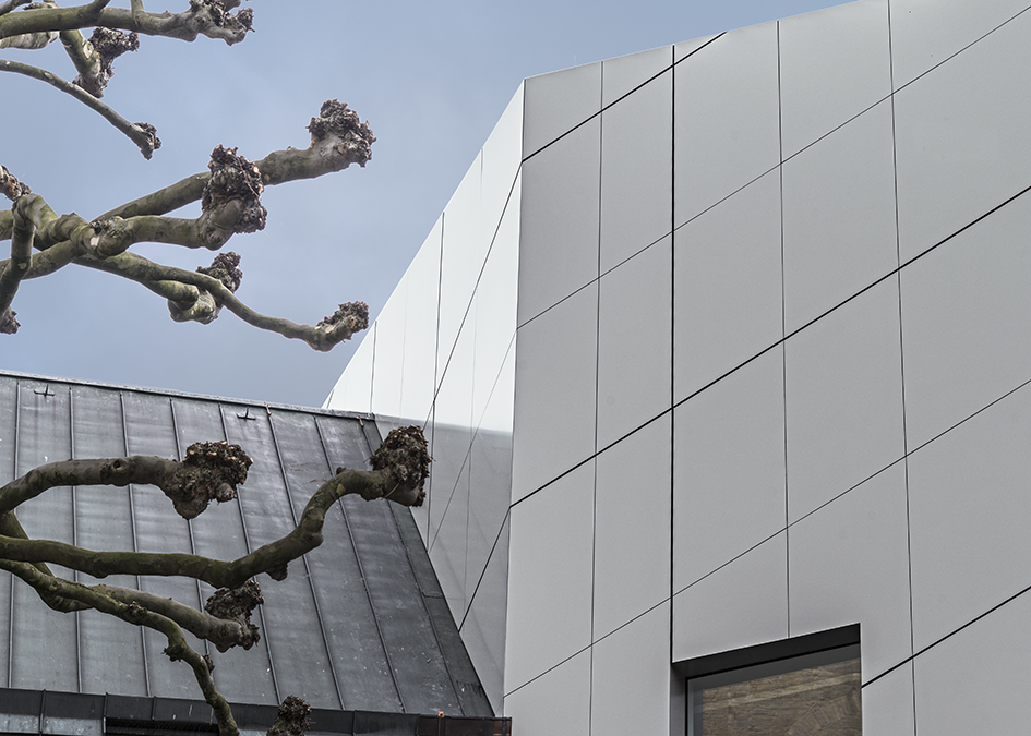 Das Dach ist leicht geneigt und gleicht auf diese Weise den Höhensprung zwischen dem First des Gemeindehauses und der Traufe der angrenzenden Stadthäuser aus. Die Metallabdeckung sollte sich ursprünglich bis über diese schräge Fläche erstrecken, wurde jedoch schließlich aus Kostengründen nur als einfache Flachdachkonstruktion umgesetzt.